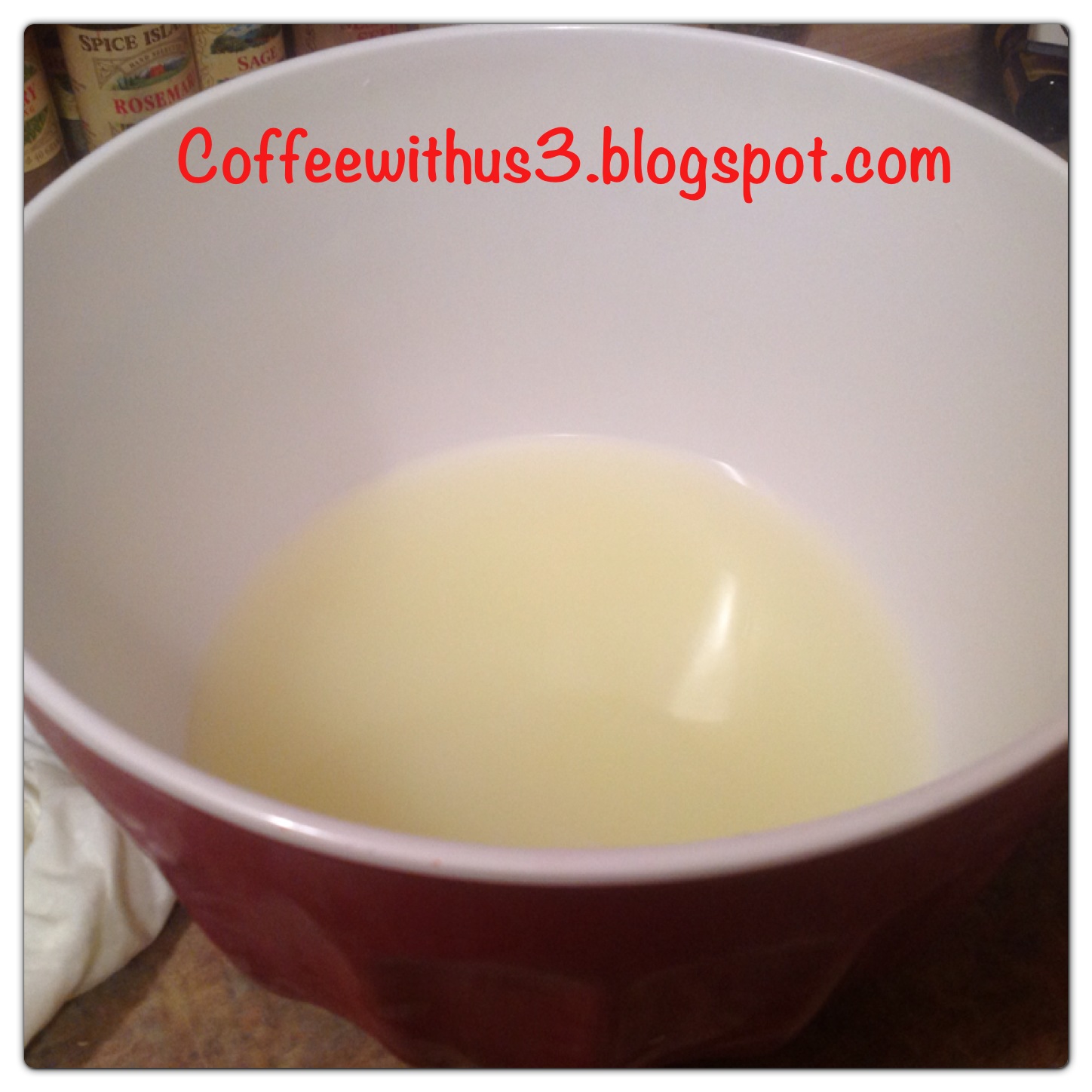Place the colander over the large bowl and place the muslin in the colander covering it. Pour the mixture into the muslin lined colander. Allow to sit for 30 minutes. Then pull up the sides of the muslin and tie together with the rubberband.